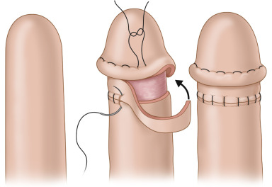For a glansplasty ( Fig. 19.8 ), we prefer to create the neocoronal ridge before elevating the flap. To create a more natural appearance of the glans, the neocoronal ridge can be marked out in a boomerang shape but a plain circumferential incision is also acceptable. The incision is made about 3.5–4.0 cm from the distal tip of the neophallus. A proximally based 1 cm skin flap is elevated in the deep dermal plane circumferentially around the phallus. The thin skin flap is folded onto itself and secured with interrupted 5-0 polyglyconate suture to create the corona. The palmaris longus tendon or a thin strip of acellular dermal matrix can be inserted within the neocoronal ridge in an attempt to reduce subsequent flattening. The exposed deep dermal/subcutaneous donor site is then covered with a full-thickness skin graft. The skin graft usually heals, appearing like a scar, similar to that seen following circumcision. Over time, the neocoronal ridge can flatten. Further reconstruction of the ridge can be accomplished by inserting acellular dermal matrix or injectable fillers. The slightly darker color of the glans can be achieved with tattoo techniques. Reconstruction of foreskin is technically not feasible or has at least, not been described.