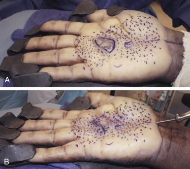 The crucial component of PALF is strong tension maintained in the direction of tissue deficiency throughout the percutaneous release process. For 2-D hand contractures defects ( Fig. 7.4 ), we use a strong lead hand retractor that maintains strong extension force. For other parts of the body ( Fig. 7.5 ), we use hooks or temporary retention sutures to maintain tension. We then adhere to the following rules as we perform the PALF: