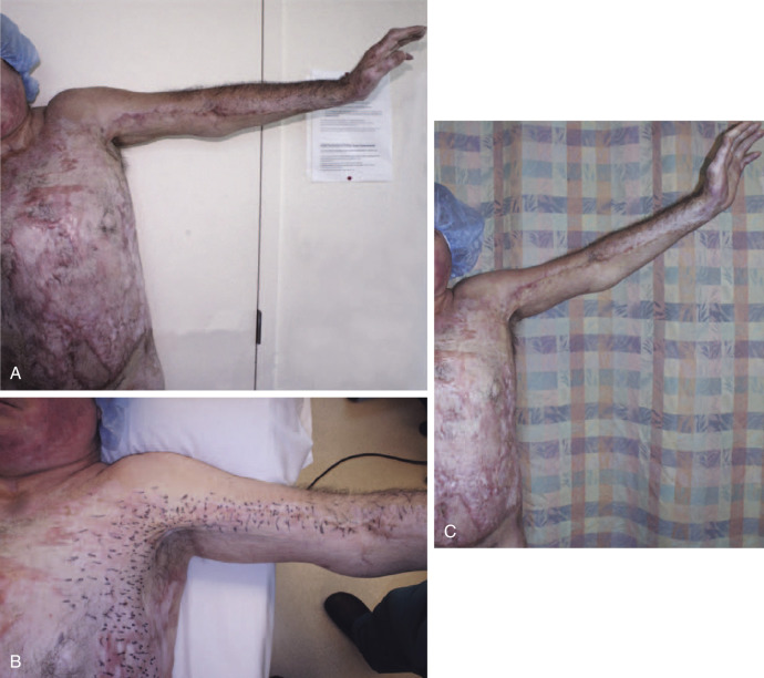 Whenever possible, we prefer to stretch-expand in 3-D, the tissue defect prior to the PALF. External expansion of the recipient site creates more space for grafting, creates more area to mesh, and prepares the skin envelope to accept the additional volume without tension. Pre-expansion also increases capillary density to preserve a functional capillary network, despite more extensive mesh release.