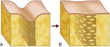 The 3-D Rigottomy of the PALF transforms a restrictive cicatrix into a larger recipient matrix with many microcavities that can support the fat grafts through diffusion until neovascularization occurs. When the microcavities in a brick-like solid scar get filled with micrografts of fat, the scar becomes less brick and more like the fat around it. Repeating the procedure can eliminate the scar and turn it into fat, as the surrounding soft tissue. The process of serial Rigottomy and fat grafting effectively transforms the cicatrix into the recipient matrix scaffold for fat grafts ( Fig. 7.6 ).