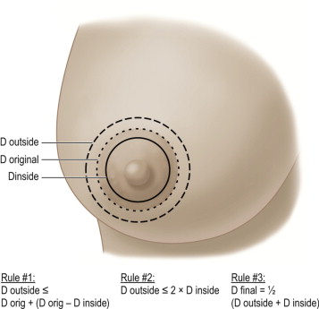 Based on the new areola position, a circular line of excision is marked. The diameter of the proposed line of excision (D outside ) based on the areolar diameter (D original ) and any amount of planned areolar reduction (D inside ) is constructed as defined by Spears ( Figure 12.1 ). The final diameter of the closure can be predicted ( Figure 12.1 Rule #3) for each breast and adjustments made to account for any asymmetry between the breasts.