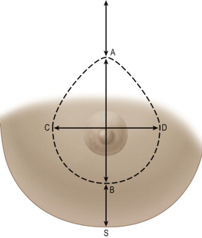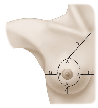 Four cardinal points are marked with the patient standing: the superior border of the new areola (point A) is marked 19–22 cm from the sternal notch; the new inferior border of the areola (point B) is marked 5–12 cm from the inframammary fold; the medial margin of excision (point C) lies 9 cm lateral of midline; and the lateral margin of resection (point D) lies 12 cm medial to the anterior axillary line. The four points are joined as an ellipse defining the limits of skin de-epithelialization ( Figure 12.7 ).