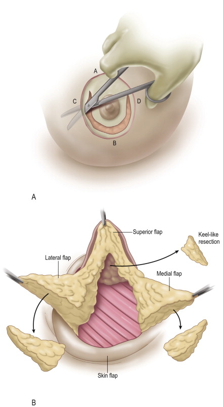 Glandular resection follows, beginning with a semicircular incision through the gland some 3 cm from the inferior areolar edge. The incision is carried deep to the level of the prepectoral space. The inferior gland is incised vertically beyond the breast meridian to the level of the fascia creating four flaps: (1) a superior dermatoglandular flap carrying the areola; (2) a glandular medial flap; (3) a glandular lateral flap; and (4) a detached skin flap ( Figure 12.3B ). The glandular flaps are trimmed being cautious of reduction along the distal ends of the flaps which will reduce their length. If the breast requires no reduction or parenchymal rearrangement, no trimming is performed.