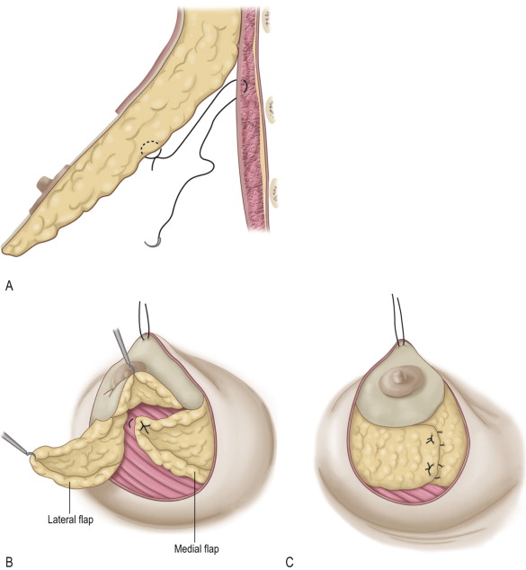 The breast is reassembled beginning with suture elevation of the superior dermatoglandular flap high on the chest wall to the pectoralis fascia ( Figure 12.4A ). Trimmed medial and lateral flaps are then folded over one another with the medial flap rotated first and sutured to the pectoralis fascia. The lateral flap is folded over the medial flap and sutured in place forming a ‘cone’ of glandular tissue ( Figure 12.4B,C ). If no trimming of the medial and lateral flaps was performed, the edges of the flaps can be simply plicated and invaginated to cone the breast shape.