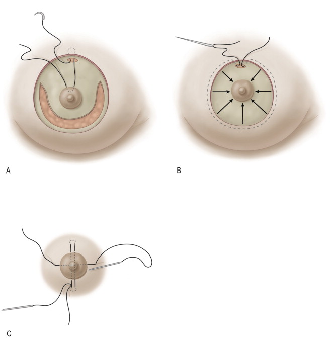 Additional coning of the breast is accomplished with ‘full-breast lacing’. Large-bite inverted sutures of braided 2-0 polyester are placed across the inferior gland as retention sutures. The sutures are tied under minimal tension and help maintain shape, particularly when the gland is fatty and less firm ( Figure 12.5 ). The deep dermal areolar undersurface is then suspended from the dermis of the superior border of the de-epithelialized ellipse with a suture passed through a small incision made at the 12 o’clock position ( Figure 12.6A ). The incision allows for the knot to be buried as the suture supports the areola without tension on the skin. A running intradermal permanent suture on a straight needle is then passed along the outer perimeter of the de-epithelialized ellipse through the 12 o’clock dermal incision. The suture is cinched down to the diameter of the areolar template and tied ( Figure 12.6B ). Diametrical transareolar U-stitches are then placed, anchored into the dermis of the breast skin edges, to help prevent areolar protrusion and better define the circular shape of the areola ( Figure 12.6C ). A 4-0 vicryl intradermal suture is run around the areola for final skin closure.