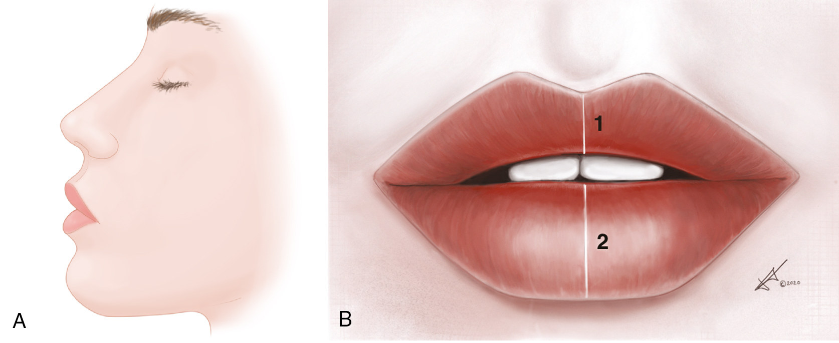 The periocular and perioral regions are the only anatomic areas that comprise two vertically aligned opposing structures (labium superius oris and labium inferius oris) defining a horizontal aperture. However, an attractive set of lips is not simply a symmetrical, good-looking upper unit situated above its identical counterpart below; the two bear distinctly different characteristics, yet they are in visual harmony in an aesthetically pleasing manner. Patients do not want to hear that they have a beautiful upper lip or a beautiful lower lip; they want to know that they have a beautiful set of lips. Plastic surgeons need to be more than just good furniture designers, so to speak; they must be good interior designers as well. By way of example, it is not good enough to just build a good-looking nose; this structure must be properly scaled to its immediate surroundings. Establishing harmonious proportions among morphologically distinct structures, in this case, the upper and lower lips, determines the crucial difference between a good result and an excellent one. For example, when planning an upper lip lift, it is essential to take into account the visual impact it would have in relation to the lower lip (interlabial harmony) as well as the rest of the face (labial–facial harmony).