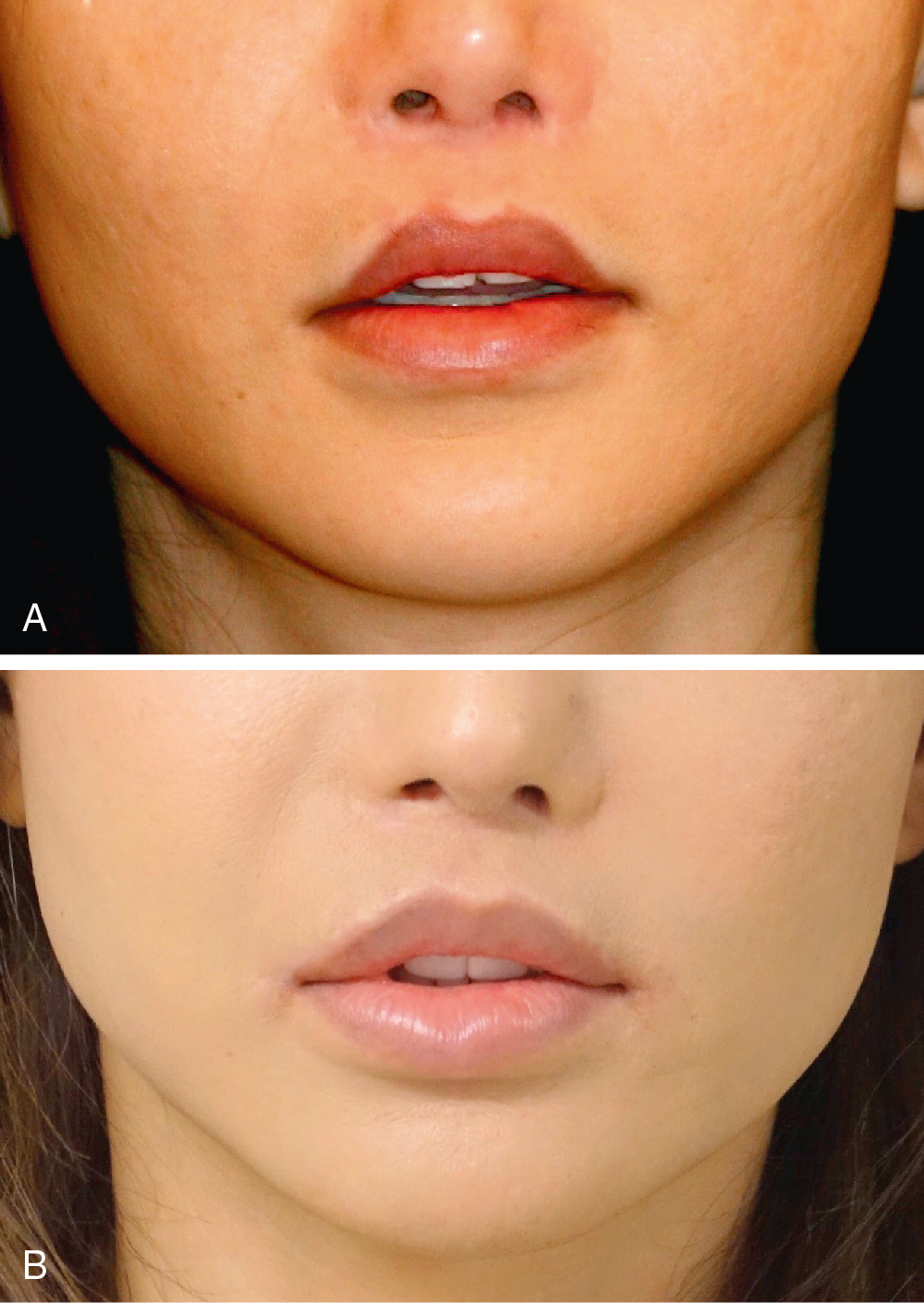 As part of a comprehensive approach to lip reshaping, the lower lip should be evaluated in addition to the upper lip. Sagging of the lower lip occurs relatively early in life; it generally appears in the mid-20s, and one of its pathognomonic signs is lower incisor show. This is clearly exacerbated by the added weight of injected fillers, especially when accompanied by microgenia or retrognathia. In this regard, lower lip ptosis, lower incisor exposure, and the chin should be all be assessed. Analysis should also include vermilion thickness and whether the labium inferius is everted or inverted.