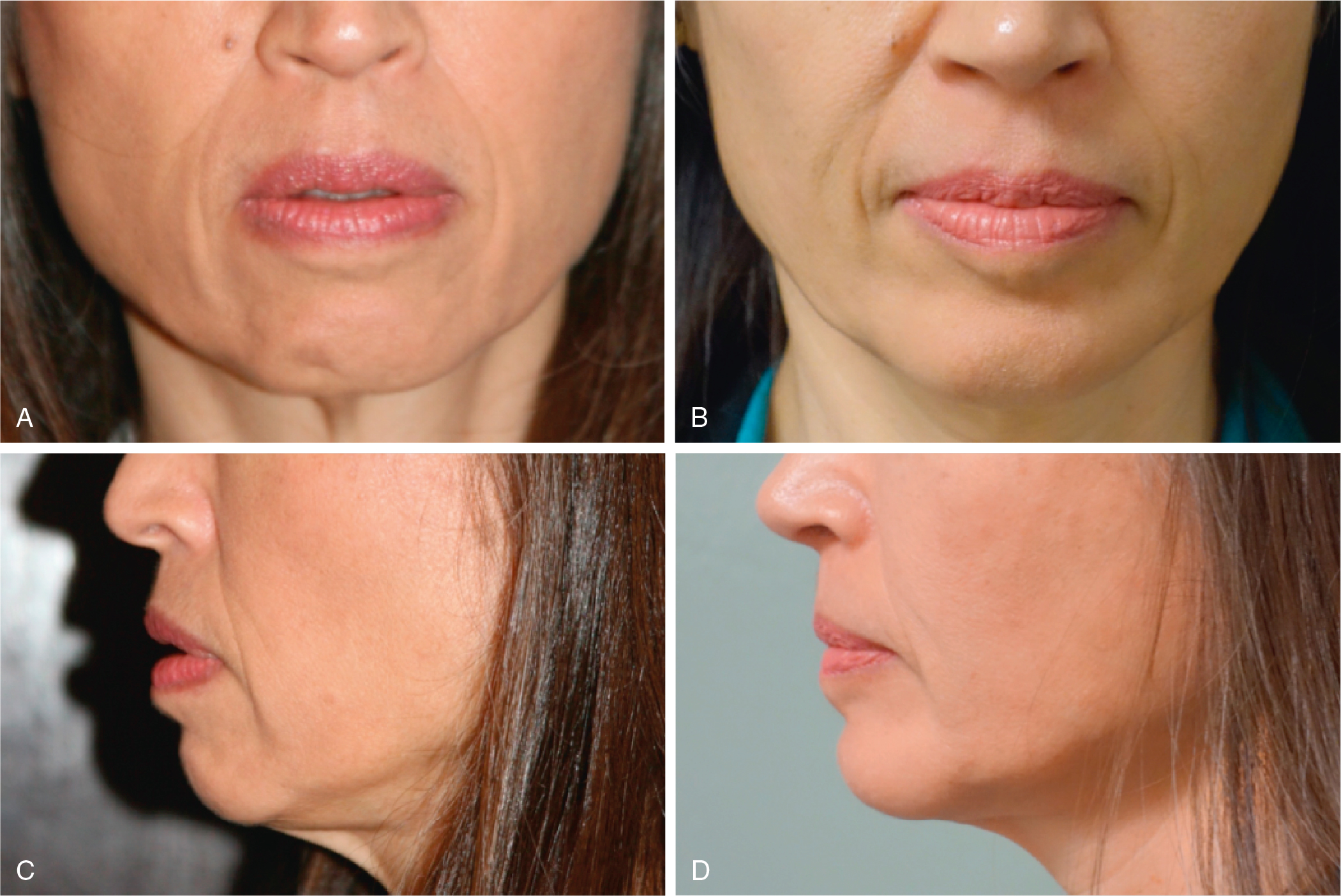 When it comes to the lower lip, the chin should also be assessed. The subjacent bony chin and musculature significantly influence the lower lip’s stance, in such a way that the chin and the lower lip is a complex that should be addressed together. The position of the chin in relation to the overlying lower lip can determine whether the lower lip everts or inverts. Specifically, the more the chin is recessed, the more the lower lip will fall forward in a hypotonic and flaccid way, exacerbating lower incisor show. This can be explained by the abnormal posterior position of the labiomental junction, or “root” of the lower lip, which acts as a tether to encourage excessive inferior protrusion of the labium inferius ( Fig. 37.6 A–D). Accompanying findings include “cobblestoning” of the chin from subconscious mentalis contraction (which reflects the added effort to close the lips) and exaggeration of prejowl sulci. In contrast, the more the chin protrudes, the likelier it is that the lower lip will be inverted. The aging process only magnifies these problems. As indicated, chin augmentation should be proposed not only to improve the profile of the lower jaw but also to provide vertically aligned support to the lower lip; indeed, it should be part of the evaluation for LRS.