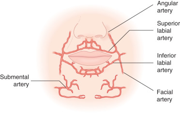 The blood supply to the perioral region is supplied by the facial artery, which is consistently identified in its corkscrew configuration crossing the border of the mandible at the anterior edge of the masseter muscle. As the artery crosses over the buccinator muscle, it runs underneath the depressor anguli oris and orbicularis oris muscles, where it gives off the inferior and superior labial arteries in succession. The labial arteries originate approximately 10 to 12 mm from the oral commissures to encircle the mouth by running within the salivary glands or buccal side of the orbicularis oris muscle. At the lateral portions of the lip, the labial arteries are approximately 10 mm apart from the lip margin then run closer to the surface as they progress medially. Additional arteries that perfuse the central lip include the columellar and septal perforators that arise from the superior labial artery and the mental artery that perfuses the chin and lower lip ( Fig. 16.3 ).