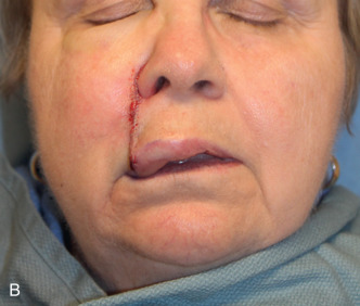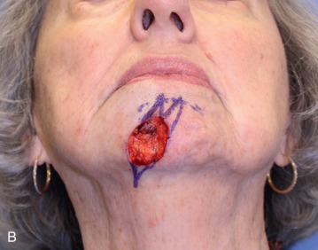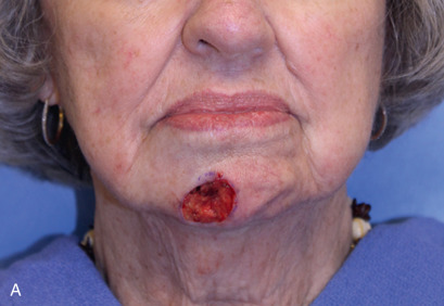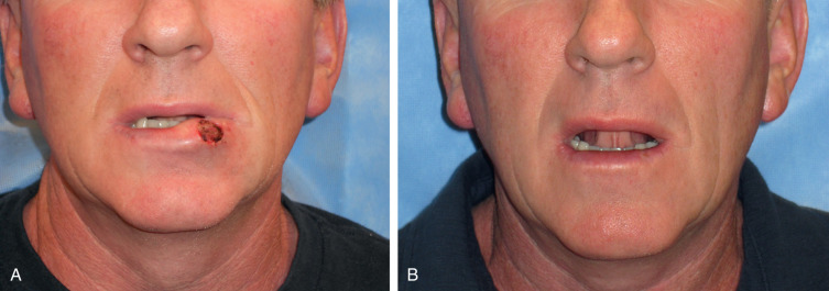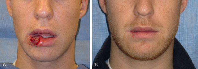 Second intention healing is a reliable approach for partial-thickness upper or lower mucosal lip defects, particularly in patients seeking to avoid additional reconstruction after tumor extirpation. Superficial defects restricted to the mucosal lip are often best managed with granulation alone ( Fig. 16.4A–B ). Patients are counseled to apply a thin coat of petrolatum after they cleanse their wound one to two times per day. With proper wound care small mucosal defects heal rapidly, and defects spanning the breadth of the entire mucosal lip will reepithelialize in less than 4 weeks because of rich anatomic vascularity ( Fig. 16.5A–B ). Larger lip defects with partial resection of orbicularis muscle and defects that cross the VCJ onto the cutaneous lip still may heal satisfactorily with second intention ( Fig. 16.6A–B ). Disadvantages of the second intention healing include visible stellate scarring, which may be more conspicuous when larger sized defects are allowed to granulate. Once fully healed, these smaller scars can be resected and repaired with minimal effort and recovery.