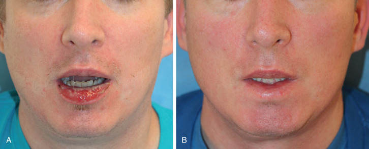 Second intention healing from vermilionectomy. (A) One week postoperative appearance. (B) Final result at 6 weeks.
