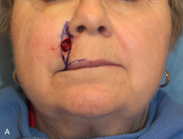 Standard design of the LC creates straight tissue incisions off of the defect that form a rhombus shape with apical angles of 30 degree or less. The final length of most LCs is approximately 3 to 4 times longer than the short axis diameter of the defect. Burow triangles, approximately the same length or slightly larger than the defect diameter, may be designed off of the defect parallel to the lip’s radially oriented RSTLs. As defects are positioned more laterally on the subunit, the final design will be drawn more obliquely in order to mimic the RSTLs. Lateral-most defects can mirror the melolabial fold curvature if tissue approximation does not excessively displace the lip or commissure ( Fig. 16.8 ).