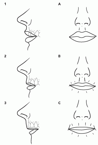 Figure 4.3.2). The orbicularis oris is in constant motion, deforming the lips to produce the dynamic movements of speaking, smiling, sucking, and whistling. Fine lines develop radially outward from the vermillion border, perpendicular to orbicularis oris force of contraction, and become deeper and longer with age.