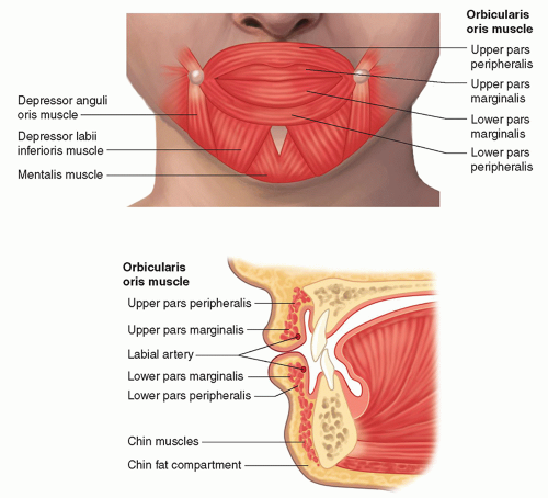 8 Perioral adipose is arranged in 2 compartments, superficial and deep to the orbicularis oris and mentalis muscles, respectively, and is also lost over time.