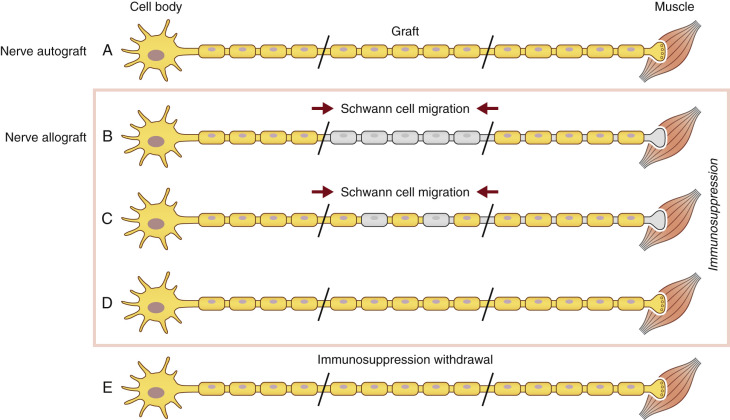 As previously discussed, SCs are an integral part of injured axonal recovery as they provided both neurotrophic factors and structural integrity. In both nerve autografts and allografts, SCs are essential for supporting axonal regeneration and subsequent remyelination. In nerve allografts, both donor and host SCs proliferate and support axonal regeneration as long as adequate immunosuppression is present ( Fig. 68.1A ).