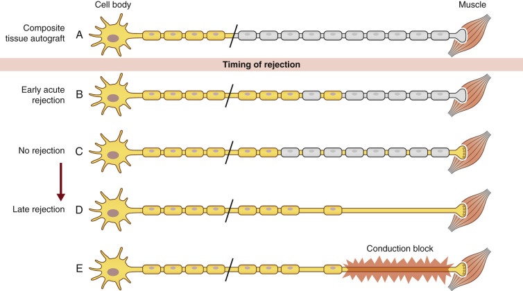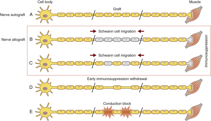 SCs are also known to play a large immunogenic role in nerve allograft rejection. They express major histocompatibility complex I (MHC-I), a molecule on cellular membranes that is responsible for displaying fragments of intracellular proteins to T cells to either trigger or prevent an immune response. Transplanted SCs also increase their expression of MHC II molecules, a family of molecules found on antigen-presenting cells and B-cell lymphocytes, increasing their host rejection response. For this reason, SCs are recognized as a prime target of the host alloimmune response. Because SCs play a large role in both axonal regeneration and allograft rejection, immunosuppression cannot be safely withdrawn until regeneration has reached the end-target organ. Functionally, removal of immunosuppression prior to repopulation of the donor graft by host SCs will result in donor SC death and a subsequent, devastating conduction block ( Fig. 68.2 ).