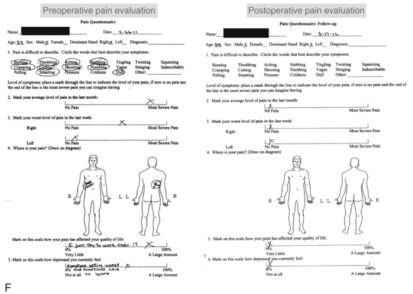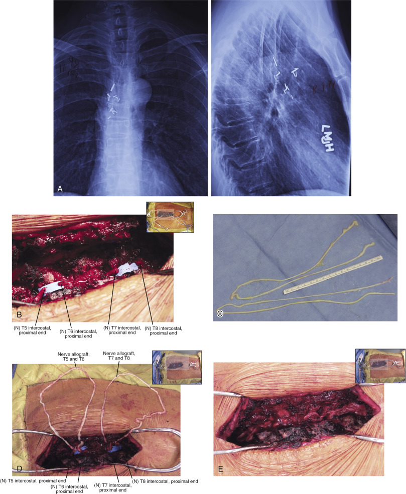 In contrast to the first 11 cases of allotransplantation, the most recent patient underwent nerve allotransplantation for significant pain after a thoracotomy. This 54-year-old man had recalcitrant right intercostal neuralgia following two thoracic operations 8 years prior to presentation to our clinic. Following his second thoracic procedure (a pleural leak repair after a right upper lobe resection), he developed severe pain localized to the dermatomes of T5-T8. His dysesthetic pain was unresponsive to conservative therapy ( Fig. 68.3 ). In a novel use of allograft transplantation, two 48 cm nerve allografts were looped between the T5-T6 and T7-T8 intercostal nerves following exposure and transection of the proximal nerve roots. Each was looped to connect two consecutive levels and allowed the regenerating intercostal nerves to taper off, preventing neuroma formation and pain. His neuralgia pain subsided by 7 months after his reconstruction. Autografts were avoided in this patient to avoid a second site of neuropathic pain. At 30 months postoperatively, the patient reported his pain was entirely resolved in the thoracic distribution and only limited to the spinal incision site. On a visual analog scale, he rated his pain a 3 out of 10. He controls his pain with topical anesthetic patches and activity modifications. He reported the procedure was “life-changing.”