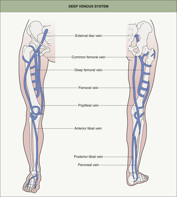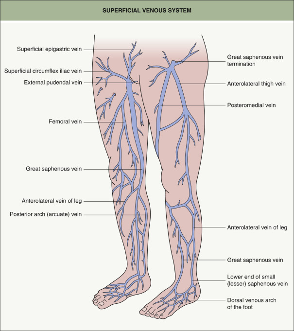 The superficial venous system is a complicated, variable network of interconnecting veins . A few of the larger truncal superficial veins are fairly constant in location. These truncal superficial veins serve as a conduit to pass blood centrally into the deep venous system. The two principal named superficial veins are the small saphenous vein (SSV), which runs from the ankle to the knee, and the great saphenous vein (GSV), which runs from the ankle to the groin ( Fig. 155.2 ).