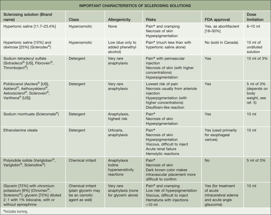 It is also important to have a working knowledge of the complication profile of each sclerosing solution (see Table 155.5 ). The osmotic sclerosants such as hypertonic saline are associated with burning and cramping on injection and an increased incidence of ulcerative necrosis secondary to extravasation.