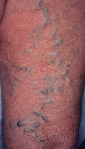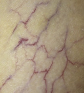 The treatment of telangiectasias and reticular veins is most commonly performed for cosmetic improvement, but up to 50% of these patients also report a variety of symptoms, from dull aching legs to throbbing pain over the telangiectasia . Telangiectasias are best defined as nearly flat, red to blue vessels 0.1–1 mm in diameter ( Table 155.6 ). Venulectasias are blue- to violet-colored vessels, sometimes distended above the skin surface and most often 1–2 mm in diameter. Reticular veins have a cyanotic blue to blue–green hue and are visually 2–4 mm in diameter. When a complex of reticular veins is located on the lateral thigh, it is felt to be a vestige of embryonal development known as the lateral subdermal plexus .