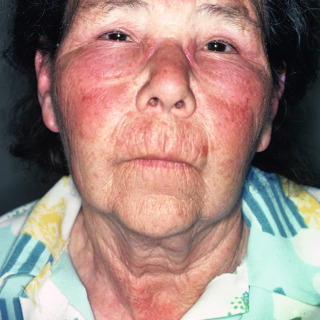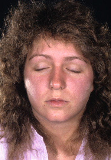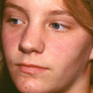 Young lady with macular erythema of the cheeks, nose, and chin that resemble the malar rash of systemic lupus erythematosus.