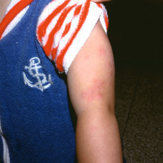 Young child with red indurated plaques confined to the sun-exposed portions of the arm.