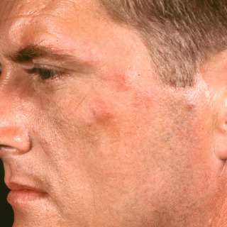 Polymorphous light eruption presenting as plaques of the cheek in a young man.
