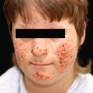Crusted dermatitic presentation of polymorphous light eruption in a child.