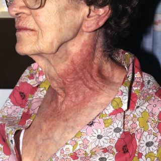 Patient with photoallergic erythema and induration of the malar cheeks and V of the neck caused by hydrochlorothiazide, one of the most common causes of photoallergic drug eruptions.
