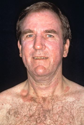 Patient with phototoxic reaction manifesting as erythema of the face, lower neck, and upper chest attributable to tetracycline.
