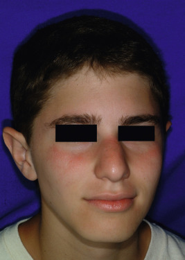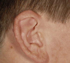 Juvenile spring eruption is considered a subset of PMLE, and is characterized by photo-induced, dull-red edematous papules that are largely confined to the helix of the ears ( Fig. 19-4 ). Lesions may become vesicular and crusted, and occasionally appear on the dorsal aspects of the hands and on the trunk. Juvenile spring eruption occurs more commonly in boys than in girls, and particularly between the ages of 5 and 12 years. Protuberant ears and lack of hair cover have been strongly associated, but skin color and use of sunscreen have not. Lesions heal within a week, without scarring, unless secondary infection develops. Lesions are more difficult than PMLE to reproduce by exposure to UV light.