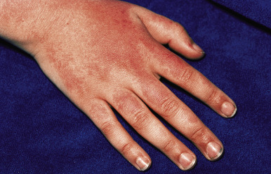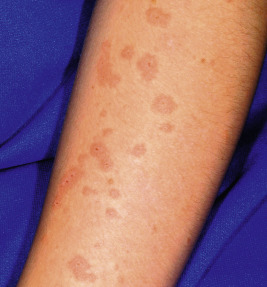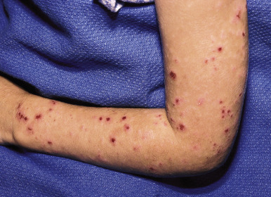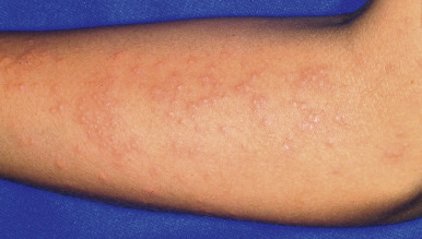 Often referred to as sun allergy or sun poisoning, the clinical eruption consists of a group of polymorphic lesions that usually occur 1 to 2 days after intense sunlight exposure, often while on vacation. In some individuals, the eruption is first seen in the spring and persists with continued sun exposure, but may improve later in the summer as the skin “hardens” from UV light exposure. The lesions may range from small papular ( Fig. 19-2 ), urticarial ( Fig. 19-3 ), vesicular, or eczematous reactions to large papules, plaques, or patterns resembling erythema multiforme. A “pinpoint” variant that resembles lichen nitidus clinically and histologically occurs more often in individuals with darker skin colors. The areas of the body most commonly involved include the face, the sides of the neck, and sun-exposed areas of the arms and hands. In children, it most commonly begins on the face as an acute, erythematous, eczematous eruption with small papules. Pruritus may be severe. Lesions usually involute spontaneously in 1 to 2 weeks, provided no additional exposure to sunlight occurs.