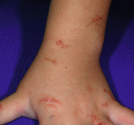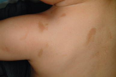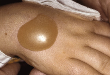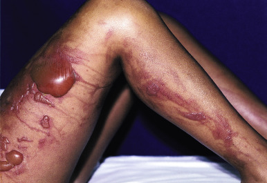 Phytophotodermatitis usually begins within a day after exposure to the furocoumarin and sunlight, ranges in severity from mild erythema with or without erosion to severe blistering ( Fig. 19-8 ), and eventuates in a characteristic dense inflammatory hyperpigmentation. A bizarre linear streaking configuration of the dermatitis ( Fig. 19-9 ), with subsequent hyperpigmentation, especially on the face, chest, hands, and lower legs of children, is characteristic. At times, only the hyperpigmented streak appears without prior erythema ( Fig. 19-10 ). The purple coloration of skin and bizarre patterning can be mistaken for child abuse and the blistering for herpes simplex infection. Streaks on the trunk have been noted after dripping of lime juice (sometimes used as a hair rinse or in drinks), and thumbprint-shaped macules on the lateral aspects of the trunk may be described after a parent with furocoumarins on the fingers picks up a child. Usually no treatment is necessary once the diagnosis is made, and the often-intense hyperpigmentation fades spontaneously over several weeks to months. However, severe burns have been induced in children by contact with phototoxins, especially giant hogweed and prolonged sunlight exposure, and have required debridement and surgical wound closure.