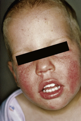 Photoallergy is relatively uncommon and presumably is a form of cell-mediated delayed hypersensitivity. The individual must first be sensitized to the allergen, which can require 7 to 10 days. When exposed to UV light, the light is absorbed by the photoantigen, which is thought to cause a change in the molecule. Instead of sunburn-type reactions, photoallergic responses are generally characterized by immediate urticarial or delayed papular or eczematous lesions that are not followed by hyperpigmentation. After the first sensitization, subsequent photoallergic reactions generally appear within 24 hours, even after very brief periods of exposure. Sunscreens with chemical components (especially benzophenones) are the leading cause because of their extensive use, although the risk of reaction with sunscreens containing these agents is less than 1% of that for allergic contact dermatitis. In the past, children showed photoallergic reactions to salicylanilides (antimicrobial agents formerly in soaps but now only in industrial cleaners) and fragrances (musk ambrette, oil of bergamot). These chemicals are no longer used in personal products, but children or adolescents have been known to find a cologne with oil of bergamot, apply it to the skin, and develop berloque (berlock) dermatitis after UV exposure. Promethazine hydrochloride cream and topical nonsteroidal anti-inflammatory agents have caused photoreactions.