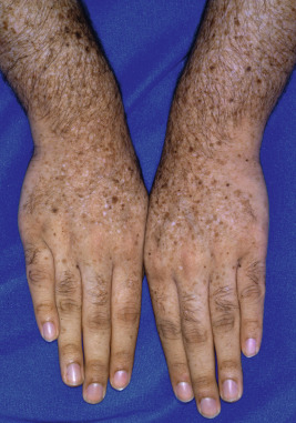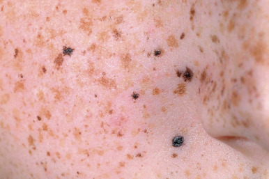 In 75% of cases the first signs appear between 6 months and 3 years of age. The presenting feature of this disorder is photosensitivity to UV light, primarily at wavelengths 290 to 340 nm, but this sunburn after minimal UV light exposure only occurs in 50% to 64% of patients and is not a feature of XP patients with mutations in XPC, XPE, or XPV. The sunburn may be severe with vesicles and bullae ( Fig. 19-14 ) and is often accompanied by photophobia with chronic conjunctivitis during the first months of life. The other 40% of cases do not show this sunburn reaction and instead tend to manifest initially with the lentigines (freckle-like pigmentation) that otherwise follow the early sunburns ( Figs. 19-15 and 19-16 ). The skin ages prematurely with atrophy, telangiectasia, mottled hyper- and hypopigmentation, keratoses, and ulcerations, but not wrinkling; these observations likely reflect the sensitivity primarily to UVB rather than to UVA light, which is the primary cause of solar elastosis. With continued exposure, the skin becomes xerotic, leading to the name XP. Areas of skin ordinarily protected by clothing remain relatively normal or may eventually show similar features, but to a lesser degree. Affected children resemble adults with severe actinic damage by early childhood.