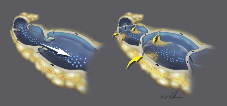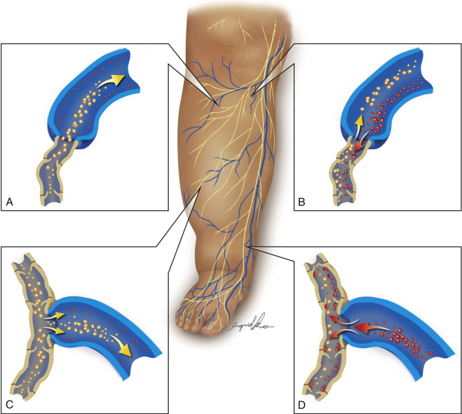 Changes to the lymphatic architecture are also evident on lymphographic studies that support histologic findings and elucidate the concept of a progression from subclinical to clinically evident lymphedema. Bidirectional flow, static networks of dye in the distal portion of extremities, and accumulation of dye at the injection site have been observed in asymptomatic, considered at-risk patients, and symptomatic patients revealing the chronic changes that ensue following an insult to proximal lymphatics. Imaging provides a dynamic method of visualizing the lymphatic vascular network and indocyanine green (ICG) diffusion patterns have been characterized based on disease severity as well. Ultimately, lymphatic insufficiency evolves into a chronic pathologic process resulting in deterioration of individual lymphatic ducts, which results in a higher density of stenosed and obliterated duct lumens. Once dependent edema is clinically evident, one can infer that the structural changes described above have already occurred.