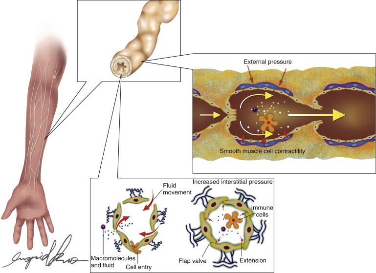 Normal lymphatic architecture is responsible for efficient clearance of lymph fluid along an extremity. Initial lymphatic fluid enters the system via a homeostatic action of the primary lymphatic valve system responding to changes in interstitial pressure. Cross-sectional analysis of a lymphatic collector/precollector reveals a trilaminar structure. The intrinsic function results in propulsion of lymph fluid by both intrinsic smooth vessel wall contraction and an intraluminal secondary valve system.