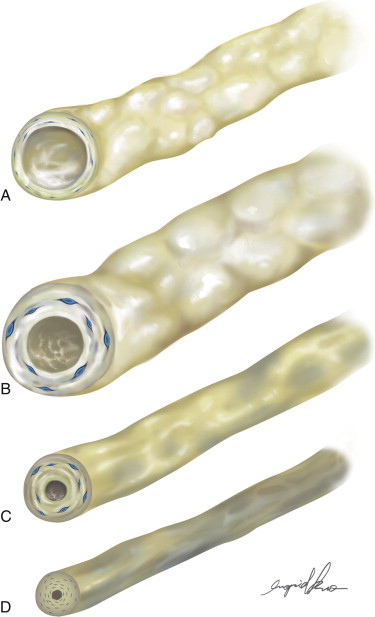 Characteristic changes occur following the presence of lymphatic hypertension (A–D) . (A) Normal lymphatic architecture reveals a smooth, trimlaminar structure with functioning smooth muscle cells. (B) Early increases in intraluminal pressure lead to dilation and ectasia of the lymphatic vessel with thinning of the intimal layer and pathologic changes to the secondary valve system. (C) Compensatory changes follow as chronic lymphatic hypertension results in vessel wall hypertrophy and ultrastructural, fibrotic changes to the smooth muscle architecture. (D) Eventually, stenosis occurs with absence of lymphatic flow.