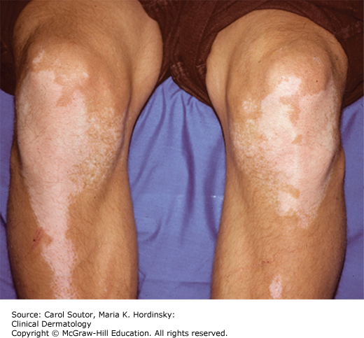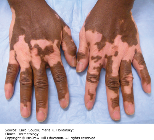 The macules are nonscaling and accentuate with Wood’s lamp examination. Lesions are often symmetric but may occur anywhere with a peculiar predilection for circumferential involvement of orifices, face and upper chest, and sites of pressure. Hair and mucous membranes may also be affected. Only rarely are borders erythematous or hyperpigmented.