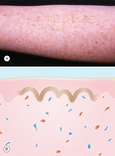 A freckle (ephelis) is a brown macule found in sun-exposed areas of the skin ( Fig. 6.1 ). The amount of melanin in the basal area of the epidermis is increased, with no increase in the number of melanocytes.