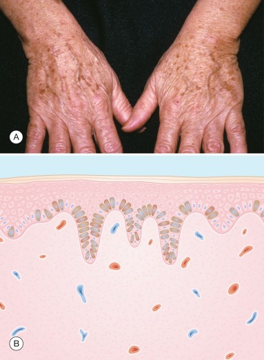 A lentigo (plural, lentigines) is a brown macule caused by an increased number of melanocytes. Two types are recognized: lentigo simplex lesions arise in childhood and are few in number, whereas actinic (solar) lentigines ( Fig. 6.2 ) arise in middle age and are numerous in sun-exposed skin.