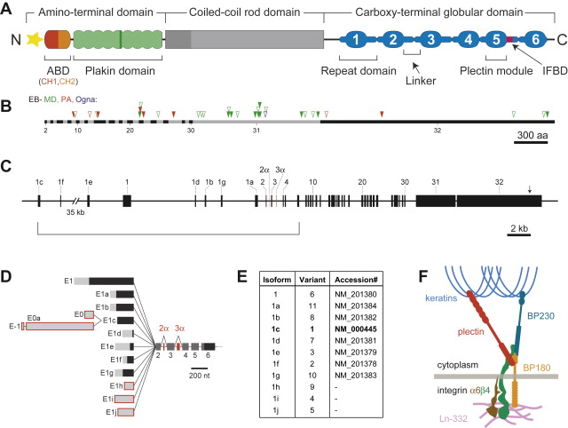 Plectin is expressed as several protein isoforms from a single gene, PLEC1, that is located on chromosome 8q24 in humans (see Fig. 1 C). The plectin gene locus in mouse (chromosome 15) has been analyzed in detail, revealing a genomic exon-intron organization with more than 40 exons spanning 62 kb on chromosome 15 and an unusual 5′ transcript complexity of plectin isoforms. Eleven exons (1–1j) have been identified that alternatively splice directly into a common exon 2 (which is the first exon to encode plectin’s highly conserved ABD), three (−1, 0a, and 0) that are spliced upstream of exon 1c, and two additional ones (2α and 3α) that are optionally spliced within the ABD-encoding exons (2–8; see Fig. 1 D). In a recent study, the human and rat gene loci were reanalyzed based on newly available genome sequences and compared to the mouse gene. In rat, all 11 alternative first exons identified in mouse were found, whereas in the human gene, so far, the presence of eight of these exons has been confirmed. Furthermore, a rodless human plectin variant, as judged by molecular size, has been detected on the protein level.