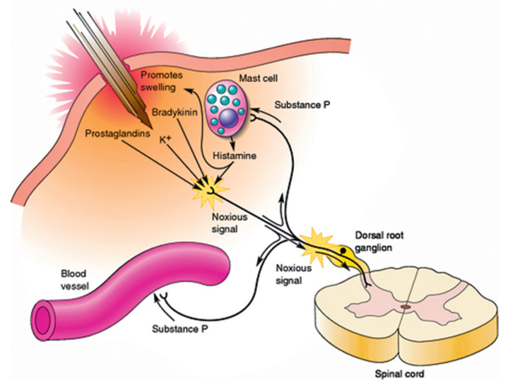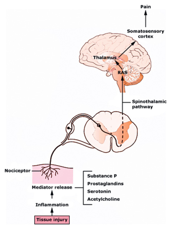 When tissue injury occurs, the release of local inflammatory mediators leads to hyperalgesia (i.e., an increased response to a painful stimulus) and allodynia (i.e., a painful response to a normally innocuous stimulus) ( Fig. 1.8.2 ). Once the pain pathway is activated, sensitization of the peripheral pain receptors (primary hyperalgesia) and increased excitability of central nervous system neurons (secondary hyperalgesia) also contribute to hyperalgesia and allodynia. Preventative analgesia is a strategy to augment peripheral and central nervous system processing of painful stimuli, thereby reducing central sensitization, hyperalgesia, and allodynia. Preventative administration of analgesic modalities throughout the perioperative period includes preemptively administrating analgesia before surgical tissue trauma. By minimizing sensitization, preventative analgesia effectively reduces post-operative pain and/or analgesic consumption beyond the duration of action of the treatment drug or technique. Evidence-based analgesic modalities available for post-operative pain control include opioids, acetaminophen/paracetamol, nonsteroidal anti-inflammatory drugs (NSAIDs), cyclooxygenase-2-specific inhibitors, anti-convulsants, IV lidocaine infusion, steroids, ketamine, local anesthetic infiltration, peripheral regional anesthesia, and neuraxial analgesia ( Table 1.8.1 ) .