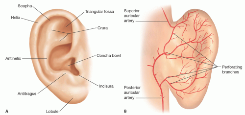 This vessel supplies the posterior ear skin and posterior auricular muscle and sends perforating branches that pierce the auricular cartilage in the region of the triangular fossa, cymba conchae, cavum conchae, helical root, and ear lobe to supply the anterior ear skin (FIG 1B).2,3