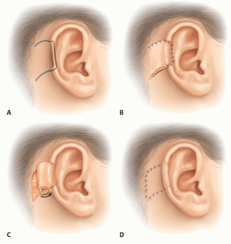 Postauricular flaps are useful for reconstructing larger marginal defects of the upper and middle thirds of the auricle and are typically used in combination with cartilage grafts for reconstructing those defects that are too large for wedge or Antia-Buch chondrocutaneous advancement techniques.1