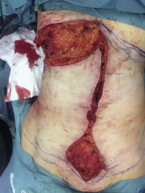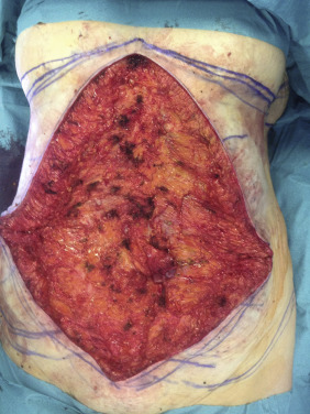 Attention is then turned to closing the wound itself. A barbed suture is used to close Scarpa’s fascia and the dermal layer. Several interrupted deep dermal sutures reduce the tension on the skin edges during closure. The umbilical stalk is trimmed and defatted. It is then inset into a circular opening in the skin and secured with 5-0 Vicryl Rapide sutures. The repair is stopped short of the superior and inferior dog-ear. The sutures are left temporarily and protected.