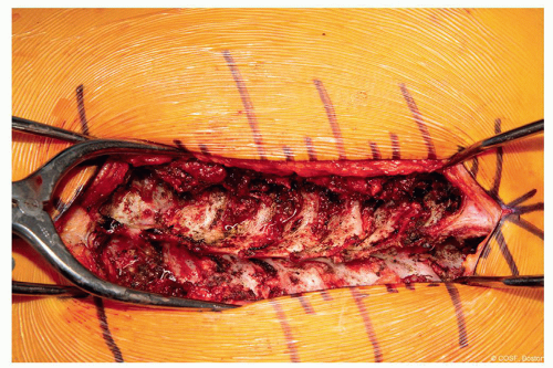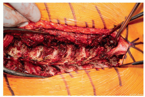 Interspinous ligament of the most cephalad level should be left intact. The fascia should be split off to each side so as to not disrupt the ligamentous attachment (Figure 3.5)