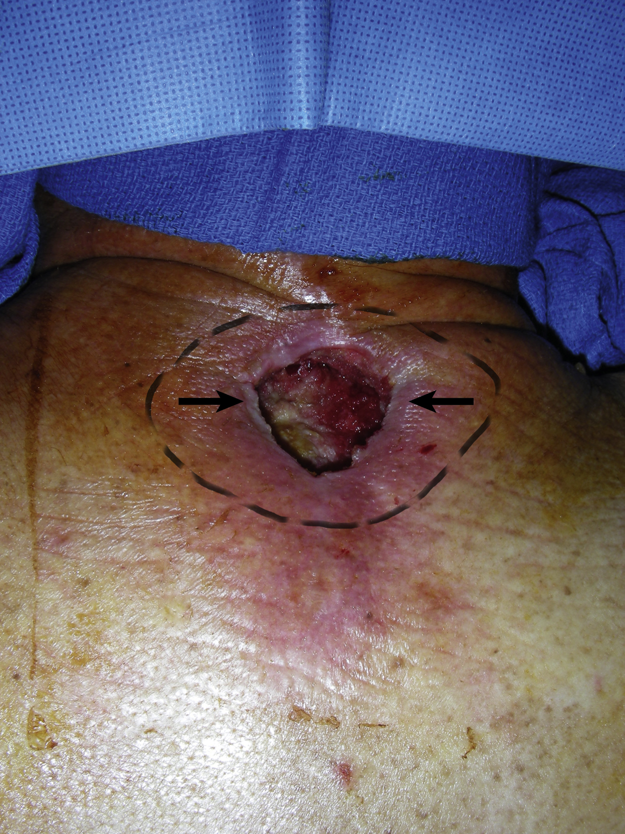Under general anesthesia, the patient was placed in the prone position. The posterior neck wound was 4 cm in diameter ( Fig. 13.2 ). The wound edges were sharply debrided to remove unhealthy-looking skin and subcutaneous tissue. The underlying exposed bone was also debrided along with surrounding nonviable tissue, with curette for the bone and electrocautery for the subcutaneous tissue and muscle.