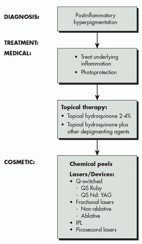 ![]() ALGORITHM 1.4.1 Treatment algorithm for postinflammatory hyperpigmentation. (Courtesy of Macrene Alexiades, MD, PhD.) |