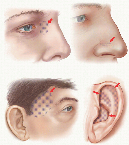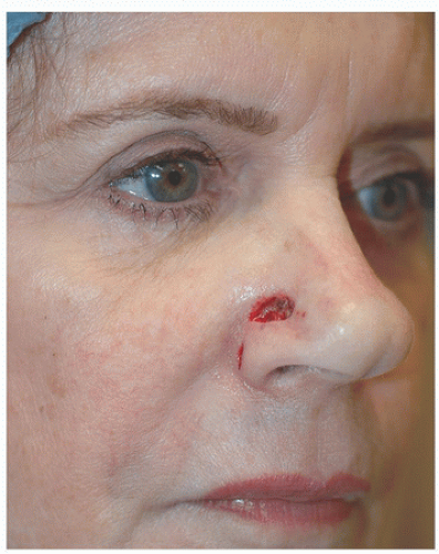 In other facial regions, superficial defects on concave surfaces of the nose (e.g., alar crease) and eyes (e.g., medial canthus) may heal well by second intention healing (Figs. 2.1A, B, C, D, E).